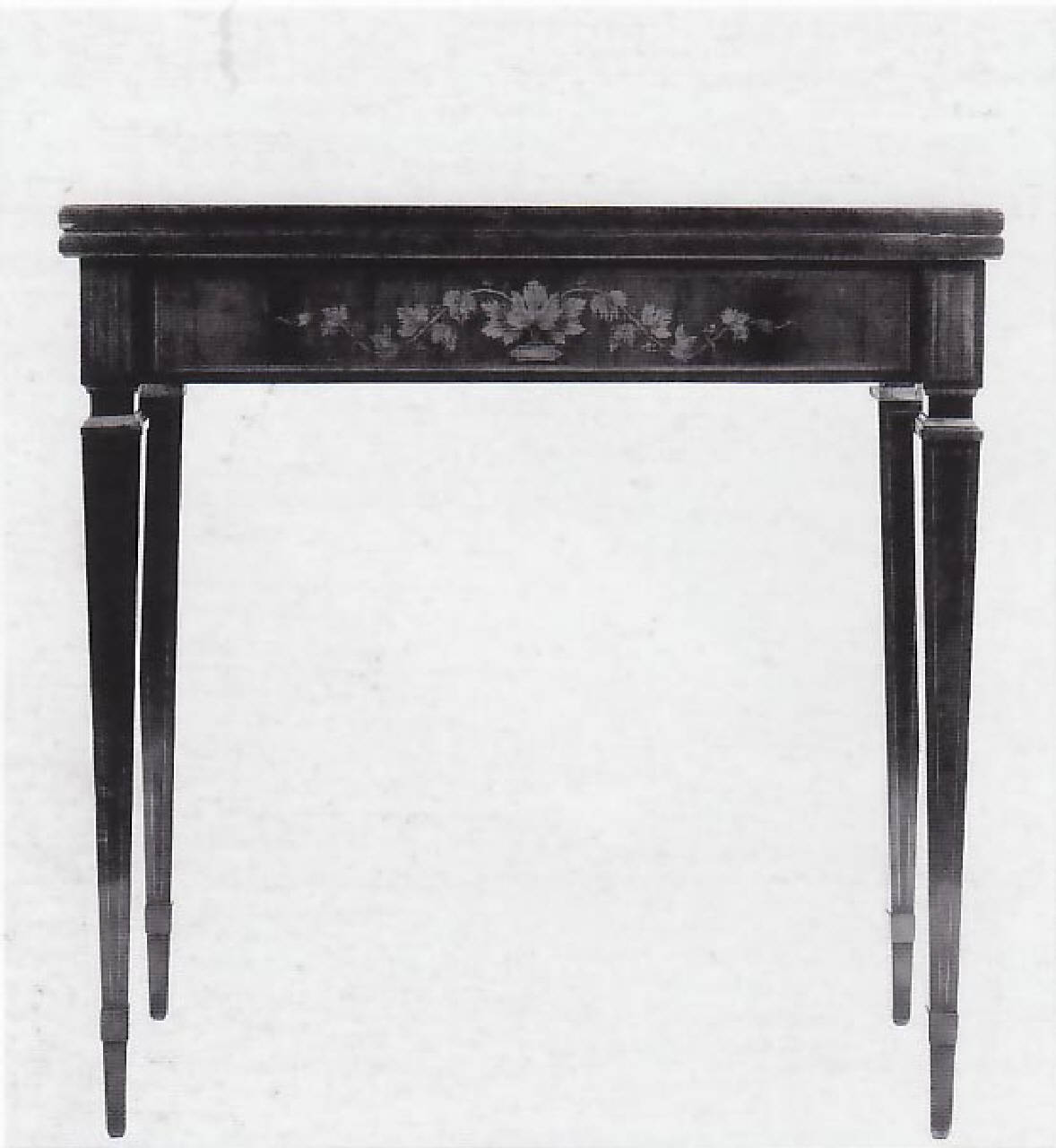 - NOTIZIE STORICO CRITICHE l tavolini con inv. 655 e 1231 presentano sotto il piano i seguenti numeri: "1231"; "1018", cancellato con vernice azzurra; "1451" in vernice azzurra e "389", "390". Mentre gli ultimi due numeri si riferiscono ad un inventario della Soprintendenza per i Beni Ambientali e Architettonici di Milano, i primi appartengono all'ultimo inventario sabaudo del Palazzo Reale di Milano (1911 circa) dove uno dei due tavolini, fin d'allora attribuito al Maggiolini, arredava il "Gabinetto da Toilette". Eseguiti dal Maggiolini, come l'esemplare con inv. 656, su commissione del governo milanese durante i primi anni dell'Ottocento, i tavolini riprendono, nei loro intarsi a motivo di trofei musicali, mazzi di fiori e tralci di foglie, alcuni dei motivi decorativi presenti nei disegni conservati nel Fondo Maggioliniano del Castello Sforzesco. In particolare i trofei con strumenti musicali derivano dai disegni inventariati ai nn. C202 e C203 che recano rispettivamente le seguenti scritte: "... un tavolino da gioco Luglio 1804 alla Villa Bonaparte a Ciceri Venezia 1805..." e "tavole da gioco alla Villa Bonaparte Luglio 1804, gran Caldo"; invece i fiori posti sugli angoli del contropiano furono ripresi da un disegno datato agli inizi del XIX secolo, mentre il motivo a tralci di vite intarsiato sulla fascia sotto il piano è stato tratto dal disegno inventariato C253 che reca al centro un riquadro con la scritta "Maggiolini". Si tratterebbe quindi di due tavolini da gioco eseguiti intorno ai primi anni dell'Ottocento per arredare le residenze reali milanesi in occasione della venuta di Napoleone e della successiva installazione della nuova corte del Beahurnais. Questo genere d'arredo, che nella forma piramidale delle gambe si rifa allo stile Luigi XVI, fu infatti apprezzato anche durante la Restaurazione: tavolini simili al nostro e appartenuti a Maria Luigia sono presenti fra quegli arredi di Palazzo Pitti, prelevati dai Savoia dalle residenze ducali parmensi dopo l'Unità d'Italia.