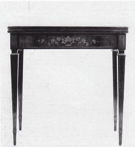 Tavolino da gioco con piano ribaltabile e gambe a sezione piramidale.
