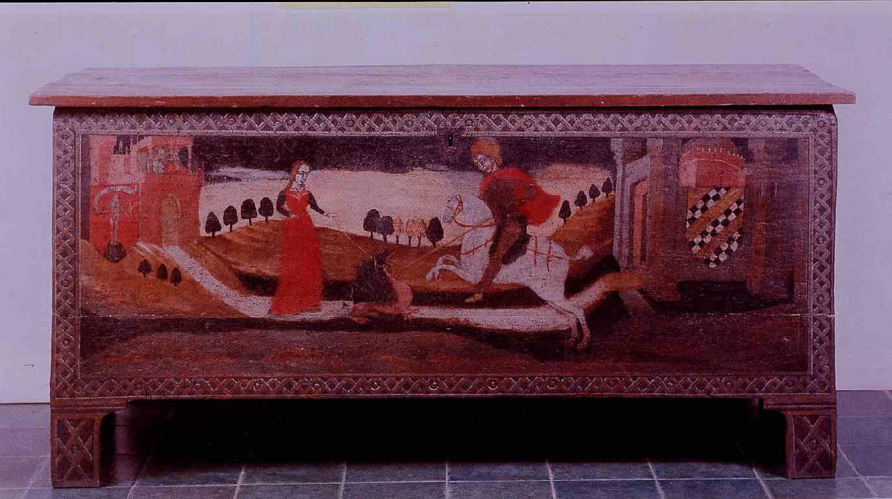 Cassone dipinto, sul fronte, con San Giorgio che uccide il drago e libera la principessa.