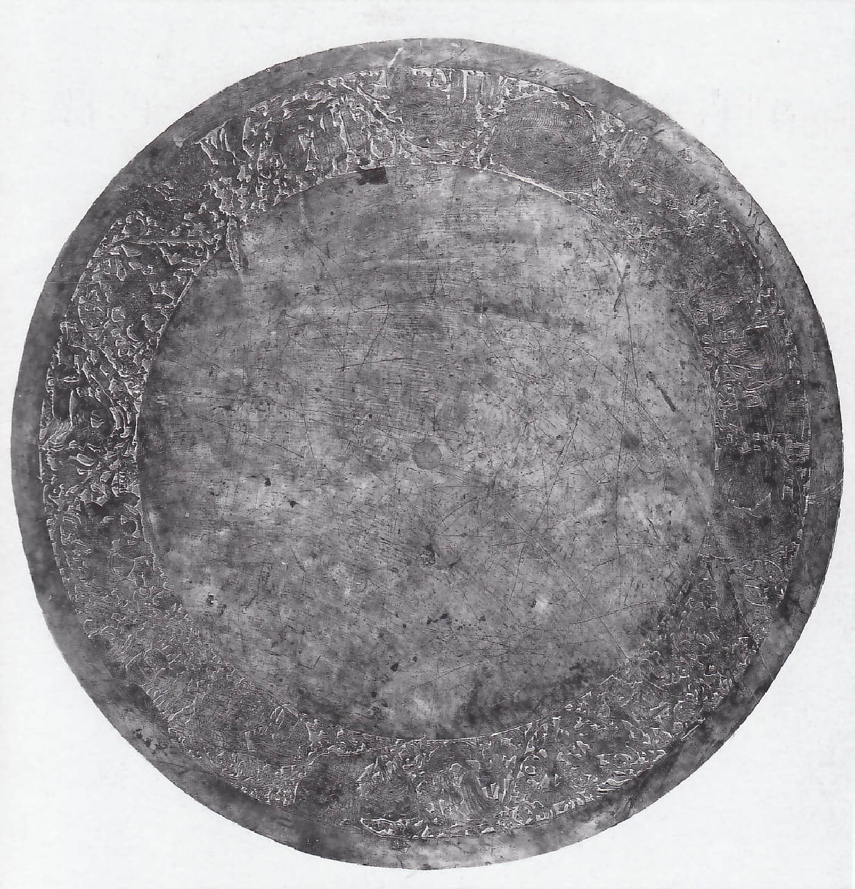 Piano di tavolo rotondo con fascia circolare intagliata con scene.
