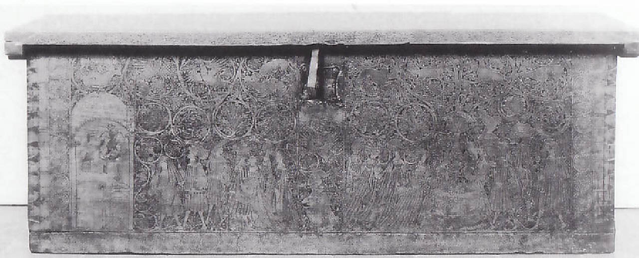 Nella parte frontale del cassone sono rappresentate due scene cortesi separate da una fascia centrale con uno scudo del tipo "torneano" in voga nel Quattrocento e nel Cinquecento. A sinistra alcune dame osservano, dalla finestra di un castello, un gruppo di signori atteggiati in varie pose, mentre a destra diverse dame e cavalieri sono isposti attorno ad una fontana.