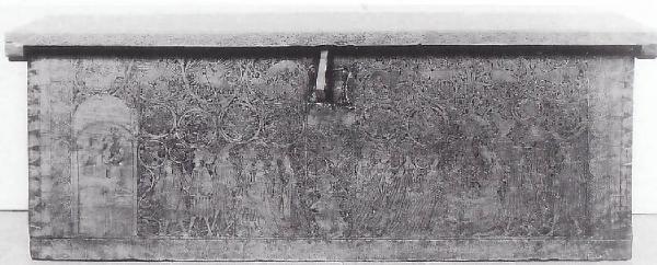 - NOTIZIE STORICO CRITICHE Attribuito dalla Rosa alla Valle dell'Adige, e cioè a quella zona della pianura padana compresa tra Mantova, Verona ed Este, dove meglio "potevano fondersi quelle correnti borgognone, tedesche ed italiane", evidenti nella decorazione del cassone, e dall'Alberici, più in generale, al Veneto, il cassone presenta un intaglio ad incavo, in parte pirografato su fondo ribassato e riempito di pasta verde, tipico delle regioni del nord Europa e diffuso, tra la fine del Quattrocento e la prima metà del secolo successivo, anche nel Trentino, nel Veneto e nel Friuli. Anche i motivi decorativi raffiguranti animali entro girali di foglie dipendono da modelli nordici e conosciuti dagli intagliatori dell'Italia settentrionale attraverso la diffusa circolazione di stoffe e ricami; mentre il tema della Fontana dell'amore è ripreso dalle pitture tardogotiche francesi, così come le vesti dei personaggi sono assai prossime a quelle indossate dalle dame e dai cavalieri raffigurati da Pisanello e dagli artisti lombardi attivi intorno alla metà del XV secolo.\nSi tratterebbe quindi di un arredo eseguito in Veneto verso la fine del Quattrocento, con tutta probabilità da artigiani veronesi che ripresero in queste decorazioni ad intaglio ribassato, i temi cortesi cari all'estetica tardogotica. Si potrebbe ipotizzare infine che l'uso di dipingere o di riempire i fondi di questo particolare genere di cassoni con paste colorate possa essere stato derivato dagli intagliatori Veneti dai rilievi paleocristiani dove le superfici di fondo erano spesso ricoperte con piccole tessere di mosaico o di marmi colorati. Con questa tecnica fu realizzata anche la cosiddetta Cassa malatestiana che (acquistata dallo Stato nel 1918 ed ora esposta nel Museo di Rimini) è uno dei pochissimi arredi superstiti delle dimore dei duchi di Mantova. Un interno di coperchio di cassapanca raffigurante la Crocefissione contornata da episodi della vita e della passione di Cristo si trova esposto al Museo Davia Bargellini di Bologna mentre un altro simile è conservato a Palazzo Pitti. Questi cassoni presentano analogie strutturali con le cassette delle Raccolte d'Arte Applicata (invv. 52 e 1156) e con due "sedie da campo", conservate rispettivamente nel Museo Bagatti Valsecchi di Milano e nel Museo Civico di Torino.