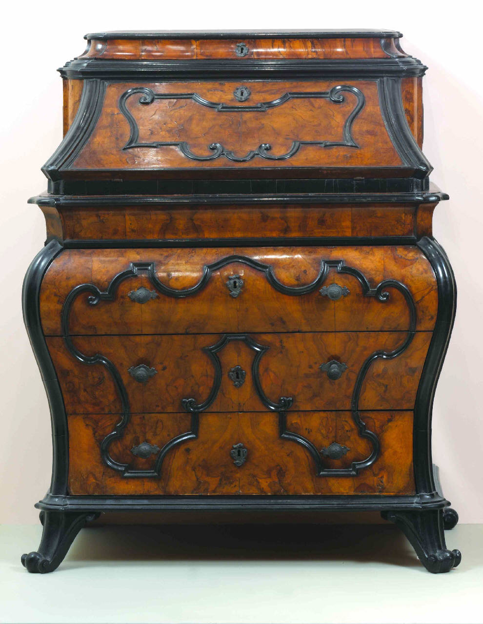 Cassettone a ribalta dalla struttura fortemente mossa e interamente impiallacciata in radica di noce abbellita con cornicette in legno tinto nero disposte a contornarne le superfici.