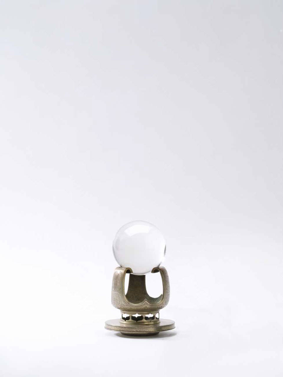 Oggetto decorativo costituito da una sfera in cristallo con suo piedistallo in bronzo, costituito da tre piedi e base circolare. La montatura è decorata a incisione con fiori, uccelli e onde.