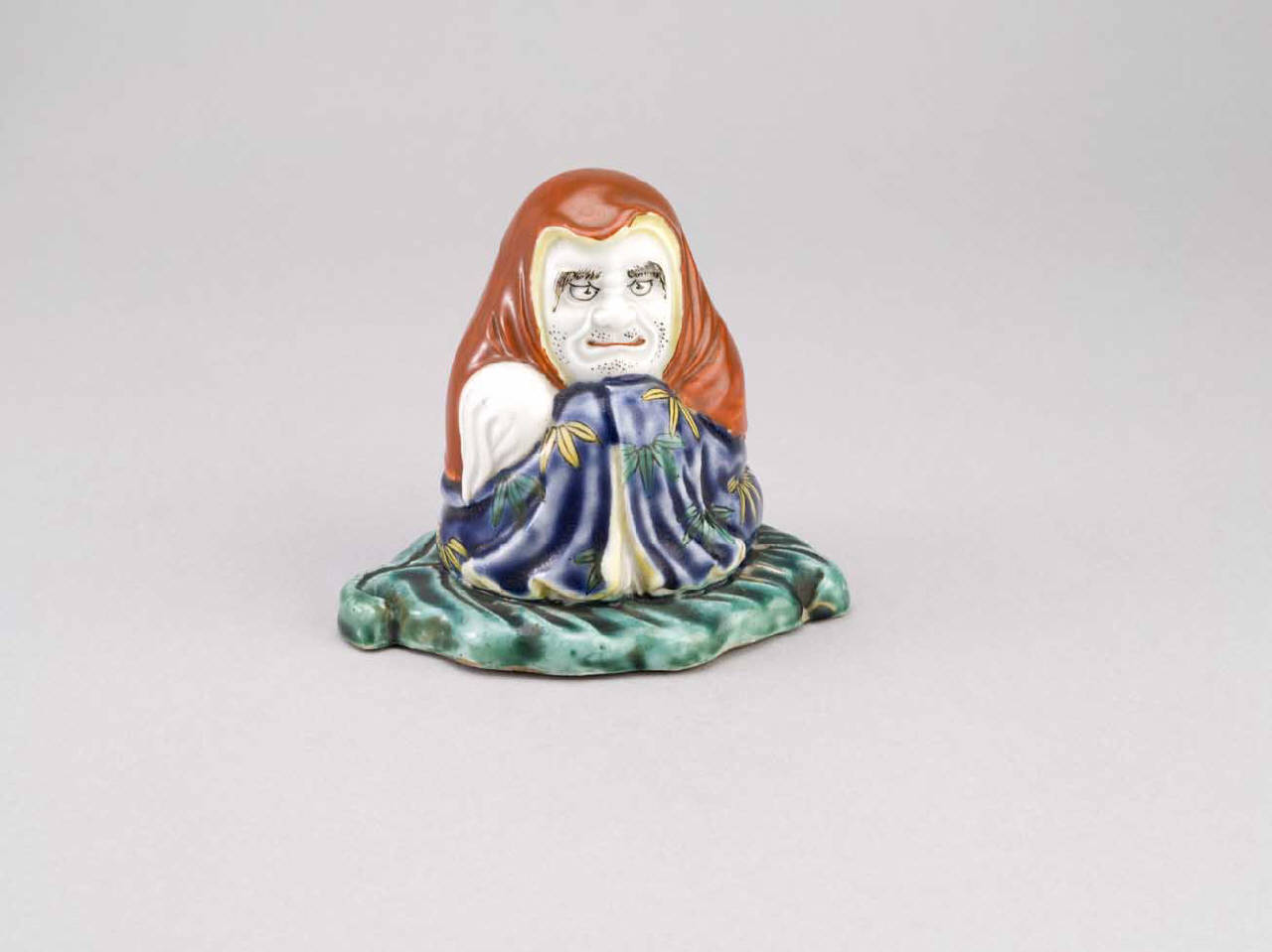 Statuetta in porcellana dipinta a smalti verde, blu, nero, giallo e rosso, raffigurante la divinità di ambito buddhista Daruma; si presenta seduta, vestita di un ampio manto che copre anche il capo.