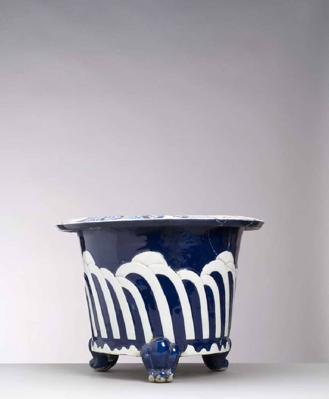 Vaso da fiori per giardino a sezione circolare, posante su tre piedi a zampa; sulla bocca si apre un'ampia tesa piatta. La decorazione, dipinta sull'esterno in blu e bianco, si svolge sul corpo con una serie di fasce dall'andamento mosso (sottolineate da bordini in rilievo) che insieme simulano delle onde marine.