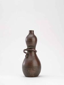 Vaso in ceramica di tonalità scura, a forma di zucca; intorno alla strozzatura centrale è applicato un cordoncino in ceramica.