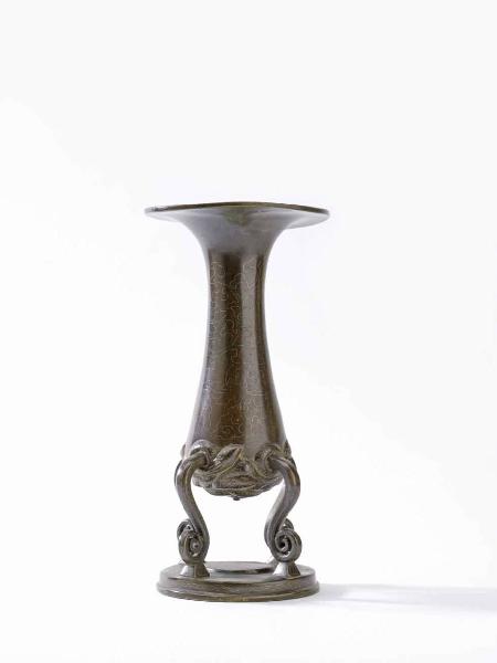 Vasetto in bronzo con ageminature in argento a sezione circolare, con bocca accentuatamente espansa; nella zona inferiore è presente un intreccio di serpenti a rilievo. Poggia su quattro piedi collegati a una base circolare.