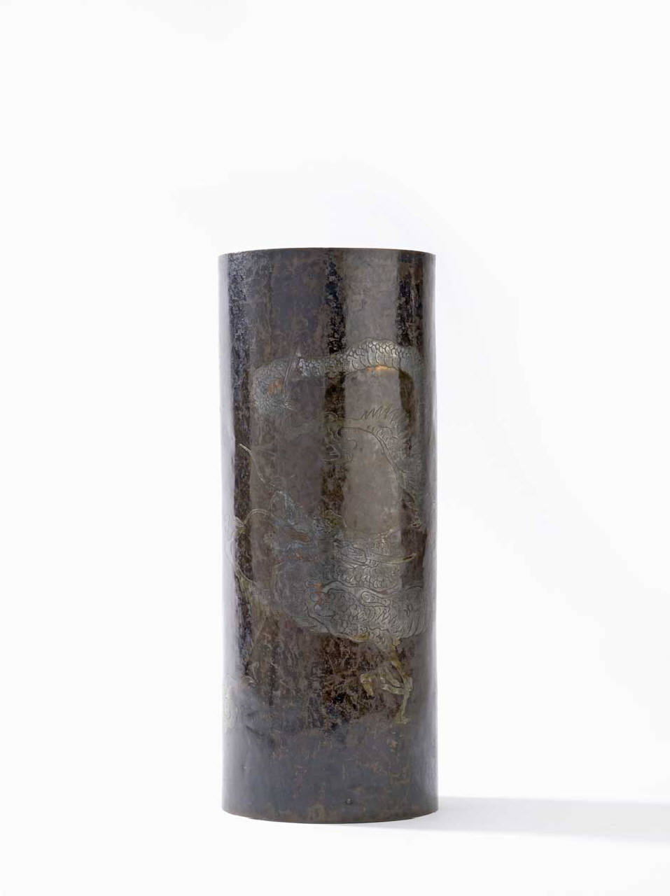 Vaso cilindrico decorato con drago tra le nubi. Intarsiato in argento.