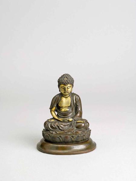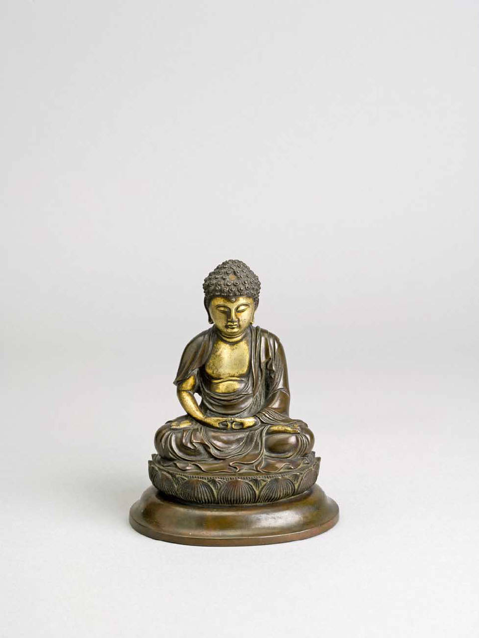 Statuetta in bronzo lavorato a fusione, dorato sul corpo e sul volto. Raffigura il buddha Amida, reso con precisi caratteri iconografici: capelli ricci, protuberanza sulla testa, posizione seduta, piede destro sul ginocchio sinistro. Le mani sono unite in grembo. Il Buddha siede su un fiore di loto.