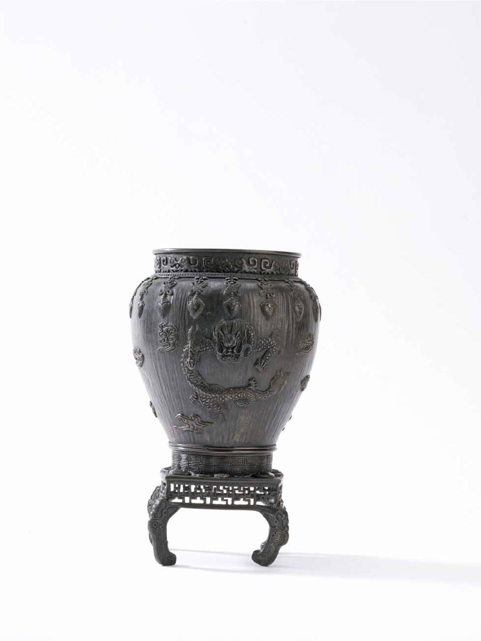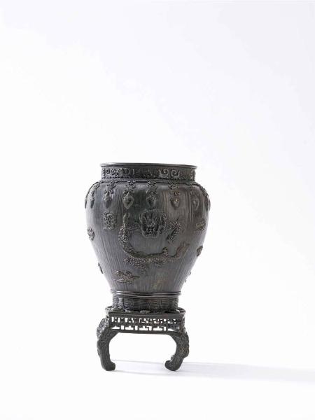 Vaso a spalla alta con breve collo a bordo verticale. La pancia poggia a incastro su una base squadrata con fascia traforata e quattro piedini modanati ricurvi verso l'interno. Il collo e inciso a greche raimon. Sul corpo è visibile un drago (ryu) tra le nuvole (kumo) in alto rilievo, verso la spalla compaiono una serie di pendagli con frutto.