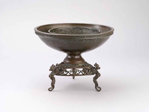 Vaso per fiori a doppia bacinella realizzato con la tecnica a fusione con stampo (chukin), questo vaso da fiori (hanaike) di tipo usubata si compone di una coppa superiore a sezione circolare al cui interno si trova un cilindro dal bordo leggermente più basso; è posto su un supporto traforato a racemi a tre piedi a forma di altrettanti draghi rampanti (ryu).