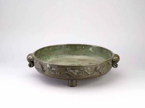 Grande bacino tripode rotondo in bronzo lavorato a fusione con stampo a cera persa (chukin) con due anse a foggia di onda, poggiante su tre bassi piedi cilindrici, decorato a bassorilievo con tartarughe marine tra le onde sulla superficie esterna. Patina marrone tendente al verde.