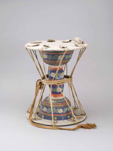 Tamburo a forma di clessidra in legno dipinto a base blu, decorato in rosso, verde, giallo e bianco su fasce parallele con motivi di girali fitomorfi. I due punti di percussione sono in pelle, connessi tra loro grazie ad un'imbracatura di cordoncini.