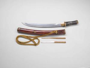 Spada corta da fianco (wakizashi) priva di guardamano (aikuchi). Lama con shinogiji, ovvero lo spazio compreso tra lo shinogi (riga che corre per tutta la lunghezza della lama) e il dorso (mune), in stile kanmuri otoshi, cioè che si restringe molto prima di raggiungere lo yokote (punto inferiore di intersezione delle righe che formano la punta della lama, kissaki), quest'ultimo assente in questo esemplare. Fodero (saya) di spada in legno laccato di nero-rosso con venature in leggero rilievo: verso il centro, è sistemata una rana in bronzo do a tutto tondo. Impugnatura (tsuka) di spada in legno laccato e superficie scabrosa; al centro è presente una fascia sulla quale si dispone la testa di un rapace ad alto rilievo e dorata. Tsuba e kashira sono in bronzo do. Spillone (kogai) in rame e bronzo. Coltellino (kogatana) in rame e bronzo.