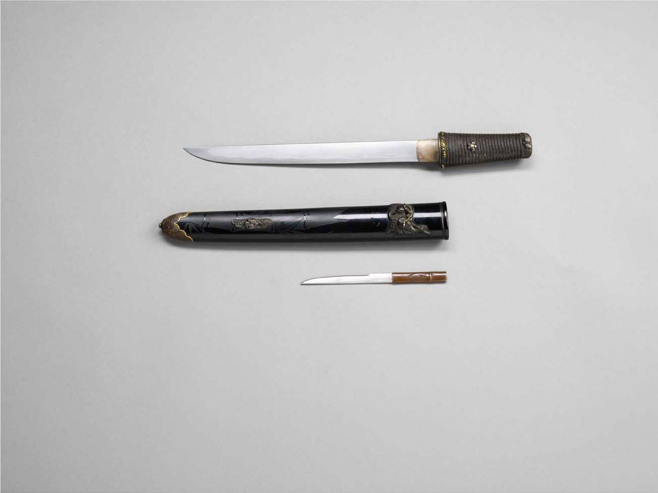 Pugnale (tanto) di tipo aikuchi, ovvero senza elsa (tsuba). La lama presenta un hamon di tipo notareba. Il fodero (saya) è in legno laccato di nero (roironuri) decorato in leggerissimo alto rilievo con fusti fogliati di bambù (take); si sovrappongono applicazioni in metallo argentato raffiguranti due lumache (forma l'anello per il cordone, kurigata) e germoglio di bambù. E' presente un sayajiri in metallo dorato. L'impugnatura (tsuka) è ricoperta di uno strato di lacca verde scuro: verso il centro è un applicato ad alto rilievo la corolla di un fiore in metallo, parzialmente dorato. Fuchi e kashira sono in ferro, decorati ad alto rilievo con dorature con motivi floreali e di insetti, conchiglie e granchi. Il manicotto (habaki) è in rame. Kogatana di dimensioni ridotte (hanzashi) con impugnatura (kozuka) in rame che riproduce una sezione di fusto di bambù (take), decorata ad incisione con foglie.