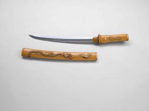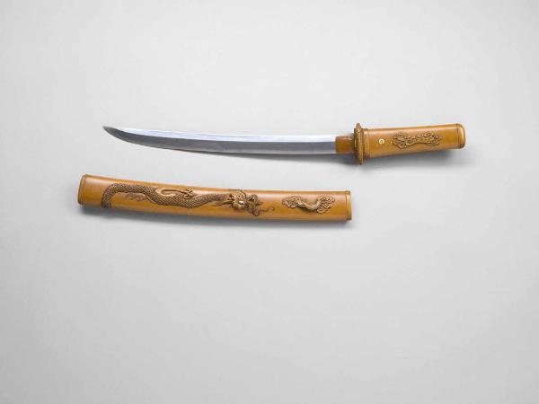 Spada di tipo wakizashi con fodero (saya) e impugnatura (tsuka) in legno nudo (shira-saya). La lama è di tipo kanmuriotoshi, ovvero con lo shinogiji, lo spazio tra il dorso e lo shinogi, di larghezza non uniforme, restringendosi verso la punta. Fodero (saya) in legno nudo (shira-saya) decorato in alto rilievo con la raffigurazione di un drago (ryu) tra le nuvole (kumo); alcuni particolari sono in osso.