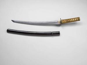 L'impugnatura (tsuka) è rivestita di pelle di pesce (same), a sua volta rivestita da una treccia di filo (tsuka-ito) marrone; è presente un menuki (piastrella ornamentale che copre uno dei due bulloni sull'impugnatura) a forma di drago (ryu). Il fuchi, ovvero la ghiera ornamentale dell'impugnatura, mostra un decoro in alto rilievo con due samurai in movimento. Il manicotto (habaki) è in rame argentato. La tsuba, in shakudo a patina nera, ha forma ovale (tatemaru), superficie liscia (migakiji), decorata a incisione (katakiribori) con un drago (ryu) tra le nuvole (kumo) e onde marine (nami).