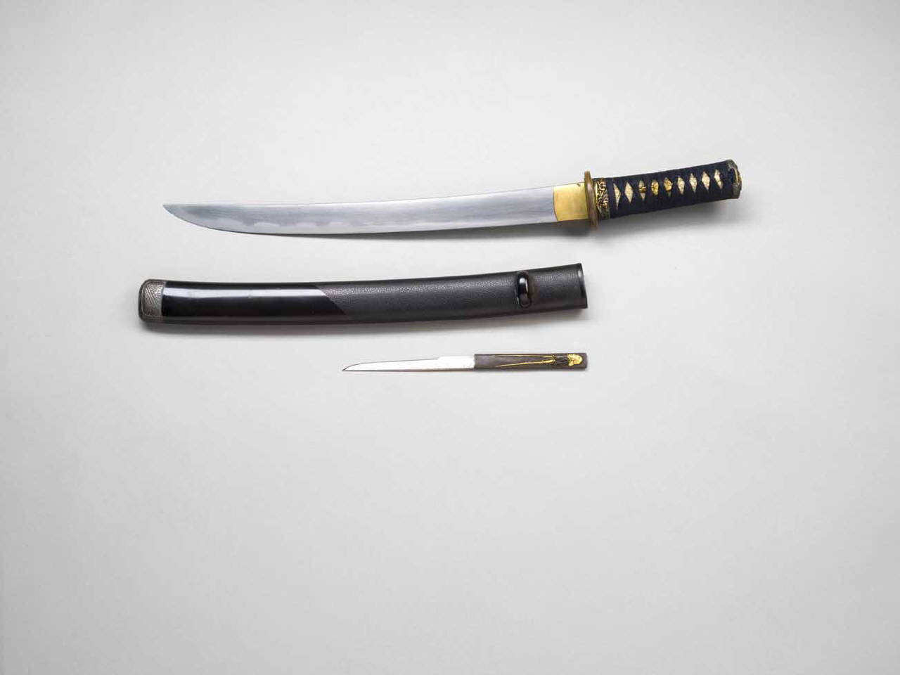 Spada corta da fianco (wakizashi) con coltellino (kozuka). Lama corta di pugnale, tanto, con linea di tempra, hamon, di tipo gunome midare. Il fodero (saya) è in legno laccato di nero omogeneo (roironuri), in parte liscio e in parte, verso l'imboccatura per la spada (koiguchi), con superficie granulosa; è presente l'anello (kurigata) per il passaggio di un cordoncino. Il puntale è in metallo con decorazioni geometriche in agemina d'oro e d'argento. L'impugnatura (tsuka) è in legno rivestito di pelle di pesce (same), a sua volta ricoperto da un intreccio di cordoncino in seta (tsuka-ito) di colore nero. E' presente un menuki in metallo dorato con gallo (tori) e ventaglio; stesso motivo anche per la tsuba. Fuchi e kashira sono in shakudo (lega di rame, bronzo e oro) decorati a rilievo in agemina d'oro e d'argento con scene di battaglia. Il manicotto (habaki) è in rame. Il coltellino (kogatana), firmato, presenta un'impugnatura (kozuka) in bronzo shakudo decorato con una punteggiatura regolare (nanako), con la raffigurazione in alto rilievo (takabori) ad agemina di oro (takazogan) di un'aragosta (ebi).