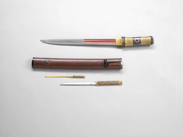 Pugnale (tanto) di tipo aikuchi, ovvero privo d'elsa. Impugnatura in ottone inciso a disegno geometrico e fasce centrale in rame argentato. Fuchi e kashira in ferro con decorazione a motivo geometrico. Manicotto (habaki) in ottone dorato. Il coltellino (kogatana), firmato, ha un'impugnatura (kozuka) in ottone lavorata a bulino con punteggiatura regolare (nanako), sulla quale si dispongono foglie stilizzate di paulonia (kiri) in agemina d'argento ad altorilievo (takazogan). Lo spillone (kogai) è in ottone lavorato a bulino con punteggiatura regolare (nanako), sul quale si dispongono foglie stilizzate di paulonia (kiri) in agemina d'argento ad altorilievo (takazogan).