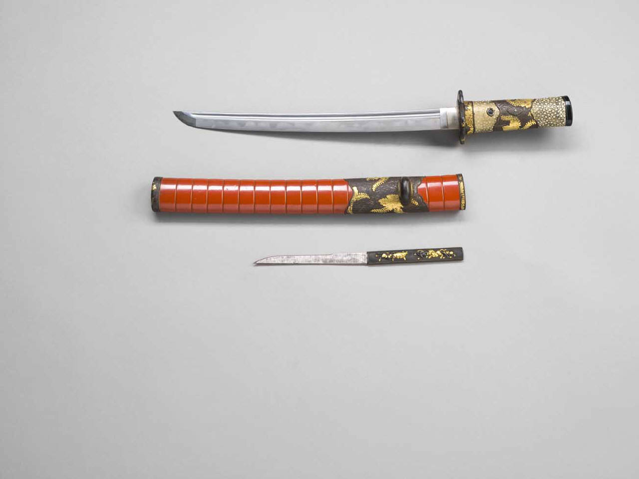 Pugnale (tanto) con fornimenti e coltellino (kozuka). Fodero (saya) in lacca rossa ad anelli con puntale e anello per il cordone in ferro decorati con foglie e fiori in oro. Impugnatura con fascia in ferro decorata con fiori e foglie in rilievo d'oro, il resto in pelle di pesce (same) bianco liscio. Manicotto (habaki) in argento inciso a linee orizzontali parallele. La tsuba, in ferro, ha forma quadrilobata (mokko), superficie martellata (tsuchimeji) e decoro di fiori e foglie di paulonia (kiri) in agemina d'oro (kinzogan) Il manico è decorato con una scena di cavalli e bufali, resa attraverso la tecnica del takabori zogan (incisione a alto rilievo con incrostazioni o intarsi) di oro e shibuichi (lega di rame, 75%, e argento, 25%).