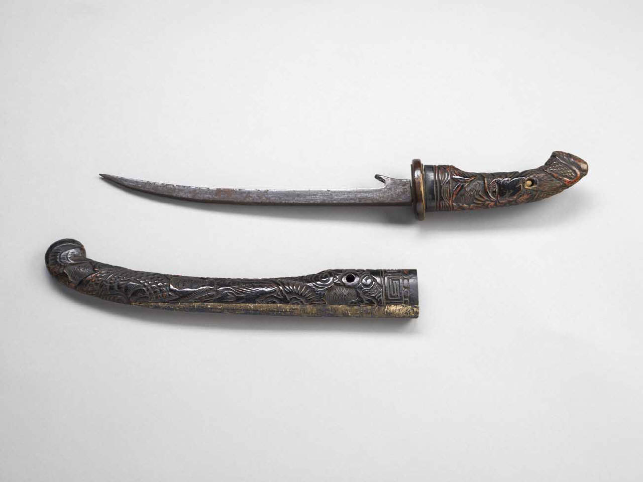 Rompispada con lama in metallo, impugnatura (tsuka) e fodero (saya) in legno intagliato e laccato di rosso.