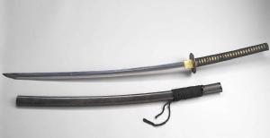 Spada (katana) completa di fornimenti. Montatura buke tsukuri. Fodero (saya) in lacca nera granulosa con anello per il cordone. Puntale in shakudo decorato con salice in agemina d'argento. Impugnatura (tsuka) con rivestimento in pelle di pesce (saya) dorata con treccia di cordoncino di seta (tsuka ito) di colore nero. Fuchi e kashira in shakudo, decorati rispettivamente con monte Fuji a rilievo con dettagli in argento e drago tra le onde con dettagli in oro. Due menuki in shakudo e ottone, raffiguranti fiori, foglie e onde. Manicotto (habaki) in rame argentato. La tsuba, in ferro, ha forma quadrilobata (mokko). La superficie è lavorata a martellate (tsuchimeji); traforata in positivo (yosukashi), raffigura il monte Fuji e due melanzane (nasu) in agemina d'oro (nunome zogan). I due fori per il passaggio del kogatana e del kogai (rio hitsu) sono ostruiti da una piastrina in piombo.