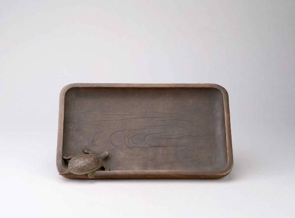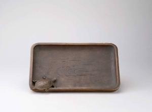 Vassoio rettangolare in legno decorato con una tartaruga a tutto tondo su un angolo e onde marine incise sul fondo.