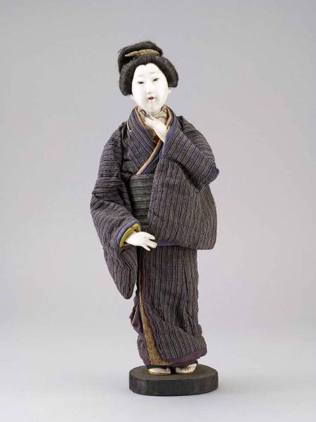 Bambola con testa e mani in legno, occhi e bocca dipinti, abito in seta e posta su un piedistallo ovale. Raffigura una donna; l'abito esterno con maniche ampie e lunghe (furisode) è decorato con motivo a strisce (komochi); s'intravedono anche lembi dell'abito interno.