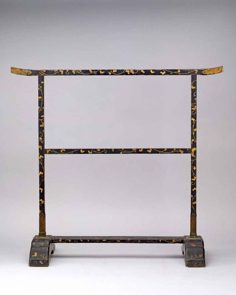 Cavalletto per asciugamani (tenuguikake) in legno laccato di nero, decorato in hiramaki-e ("pittura a oro spruzzato piatto") con girali firomorfi (karakusa). I finimenti sono in bronzo dorato.