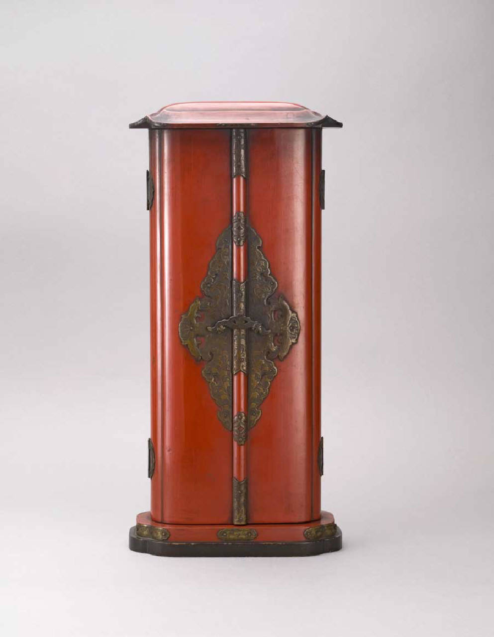 Tempietto portatile (zushi) quasi a forma di parallelepipedo, avente due sportelli apribili sul davanti che danno sull'ampia nicchia interna. Sul fondo di quest'ultima è applicato un foglio di carta dipinta raffigurante una divinità con corpo antropomorfo, volto di corvo e ali, posante sul dorso di una volpe (kitsune) bianca.