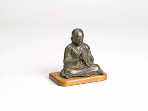Scultura in bronzo raffigurante uno dei Judaideshi, ovvero i "Dieci grandi discepoli del Buddha". Base in legno.