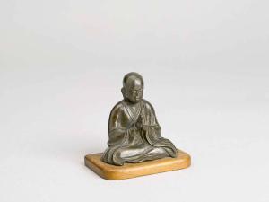 Scultura in bronzo raffigurante Makakasho, uno dei Judaideshi, ovvero i "Dieci grandi discepoli del Buddha", riconoscibile per il manto che gli copre il capo. Base in legno.