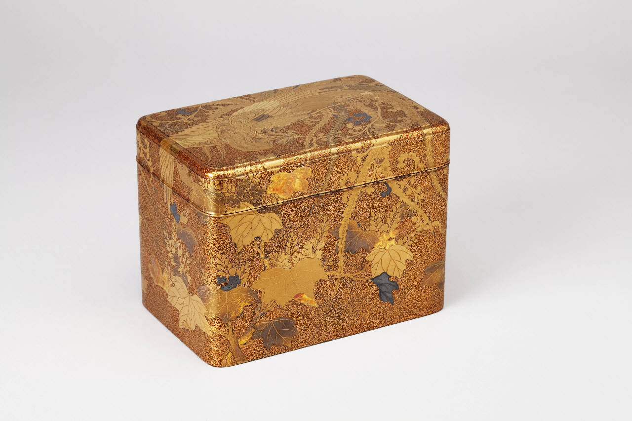 Scatola da toletta (tebako) in legno intagliato, decorato su fondo nashiji ("a buccia di pera") in maki-e ("pittura a oro cosparsa"), nelle varianti dell'hiramaki-e ("pittura cosparsa piatta") e del takamaki-e ("pittura cosparsa in rilievo"), con aggiunte di "oro ritagliato" (kirikane). L'ornato si costituisce di una fenice (hoo) tra foglie di paulonia (kiri).