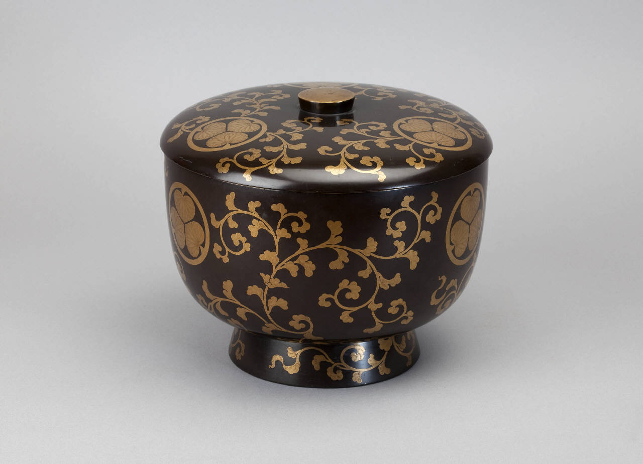 Contenitore per riso cotto con coperchio (meshiki) in legno laccato, di rosso omogeneo (shunuri) all'interno e in oro sul nero all'esterno con la tecnica usuniku takamaki-e. Tra i tralci (karakusa) stemma aoi con tre foglie di malva.