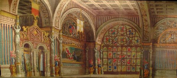 Scenografia in carta, fortezzata con strisce di tessuto di cotone, dipinta ad acqua e composta da un solo fondale con vetrata trasparente.