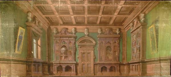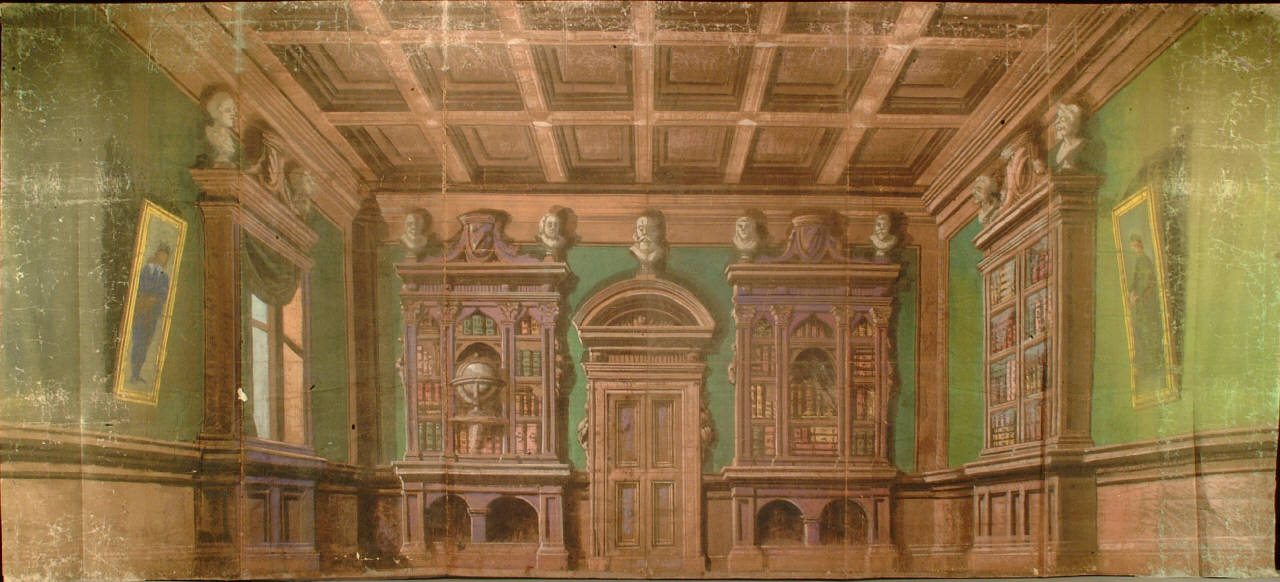 Scenografia in carta, fortezzata con strisce di tessuto di cotone, dipinta ad acqua e composta da un solo fondale.