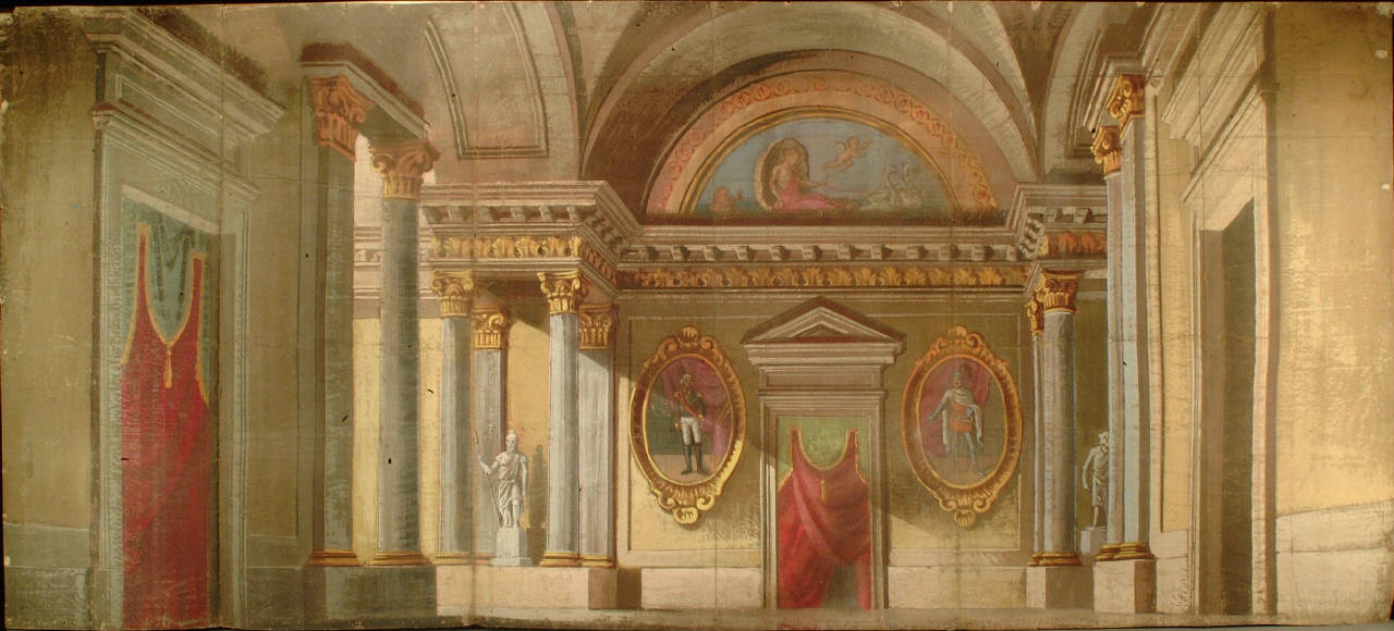 Scenografia in carta, fortezzata con strisce di tessuto di cotone, dipinta ad acqua e composta da un solo fondale.