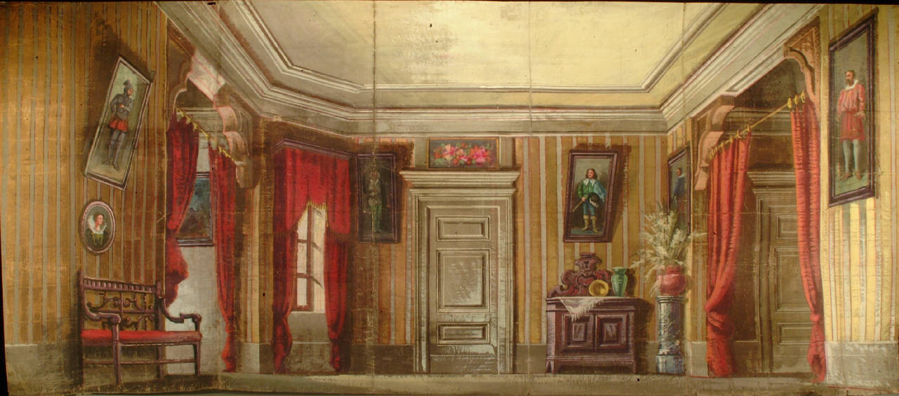Scenografia in carta, fortezzata con strisce di tessuto di cotone, dipinta ad acqua e composta da un solo fondale.