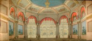 Scenografia in carta, fortezzata con strisce di tessuto di cotone, dipinta ad acqua e composta da un solo fondale.