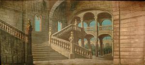 Scenografia in carta, fortezzata col strisce di tessuto di cotone, dipinta ad acqua e composta da un solo fondale.
