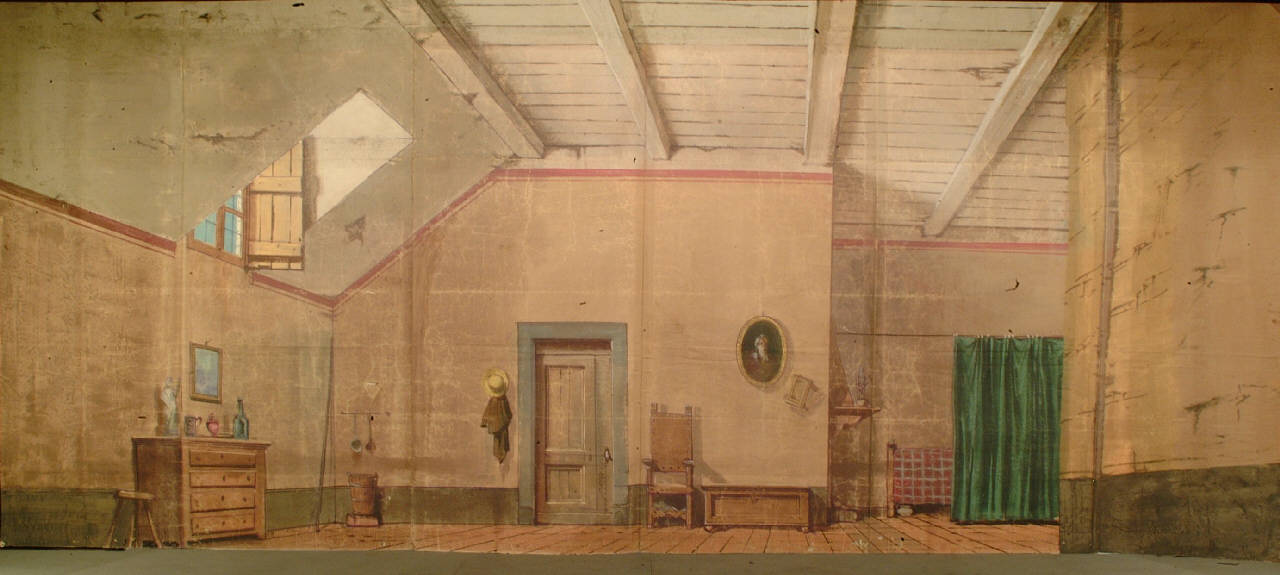 Scenografia in carta, fortezzata con strisce di tessuto di cotone, dipinta ad acqua e composta da un solo fondale.