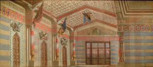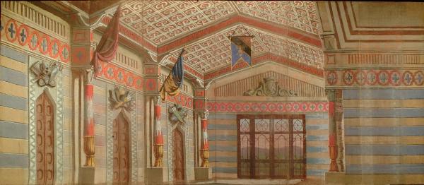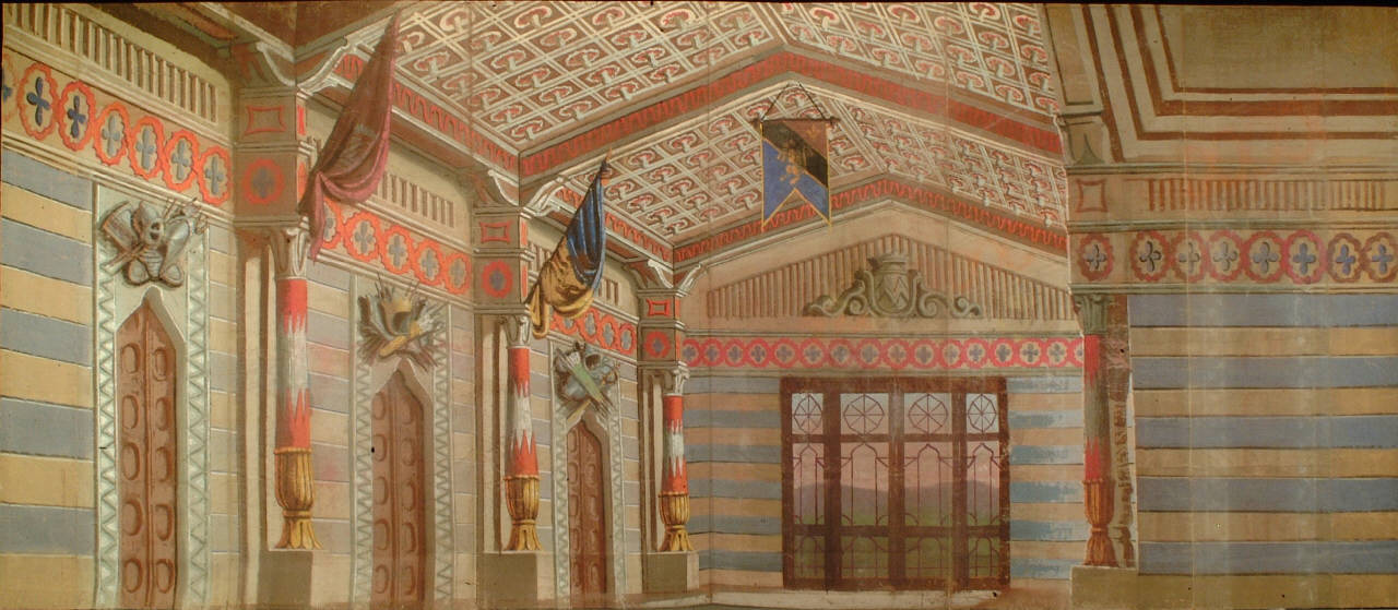 Scenografia in carta, fortezzata con strisce di tessuto di cotone, dipinta ad acqua e composta da un solo fondale.