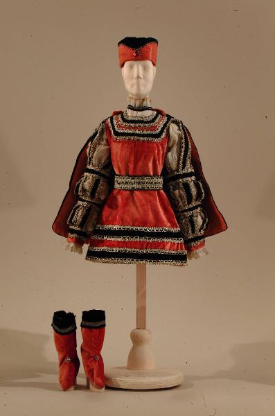 Costume per nobile di foggia rinascimentale composto da veste, mantello, scarpe, cintura e cappello
