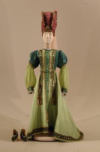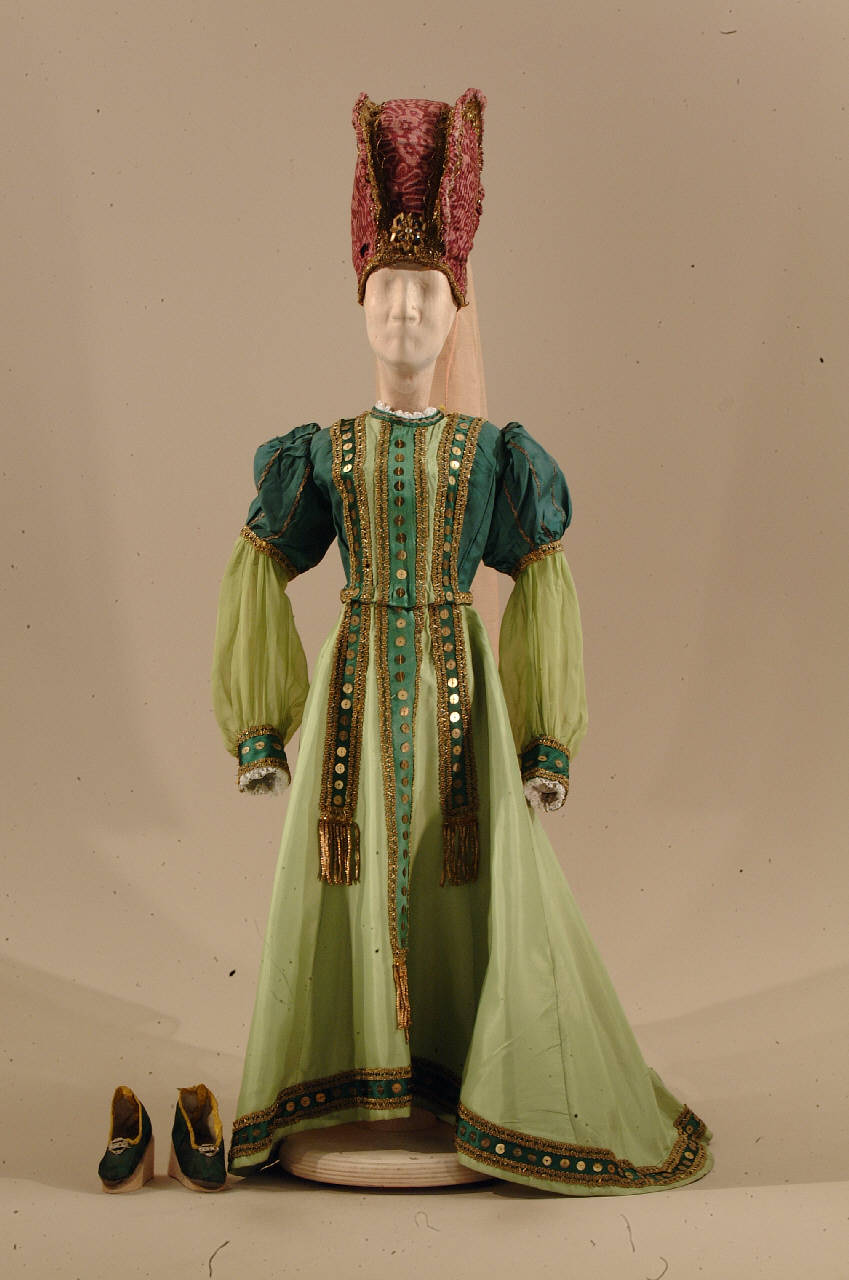 Costume per dama di foggia rinascimentale composto da gonna con corpino attaccato, cappello e scarpe