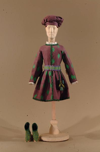 Costume per popolano di foggia rinascimentale composto da veste, scarpe, cappello, cintura con borsetta