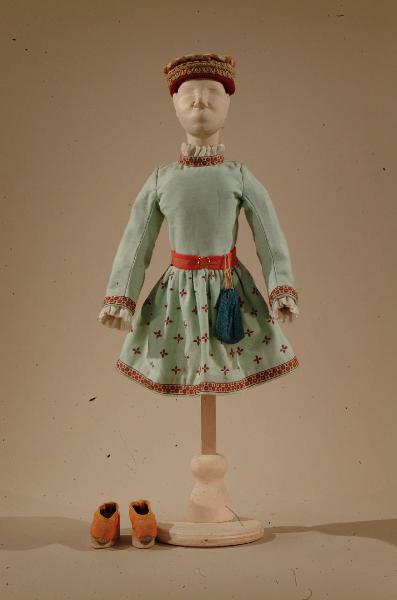 Costume per bambino popolano di foggia rinascimentale composto da veste, cintura con borsetta, cappello, scarpe