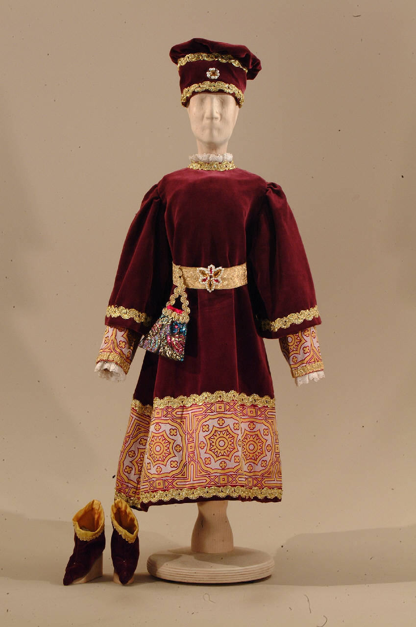 Costume per cavaliere di foggia rinascimentale composto da veste, cintura con borsetta, cappello e scarpe