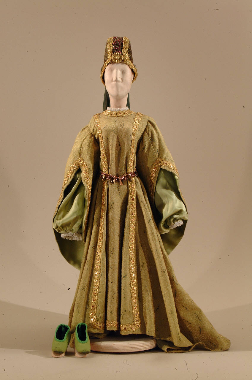 Costume per dama di foggia rinascimentale composto da veste, cintura, cappello, scarpe