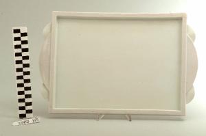 Vassoio di forma rettangolare con prese laterali semicircolari; fondo bianco con prese e bordo a puntini rosa.